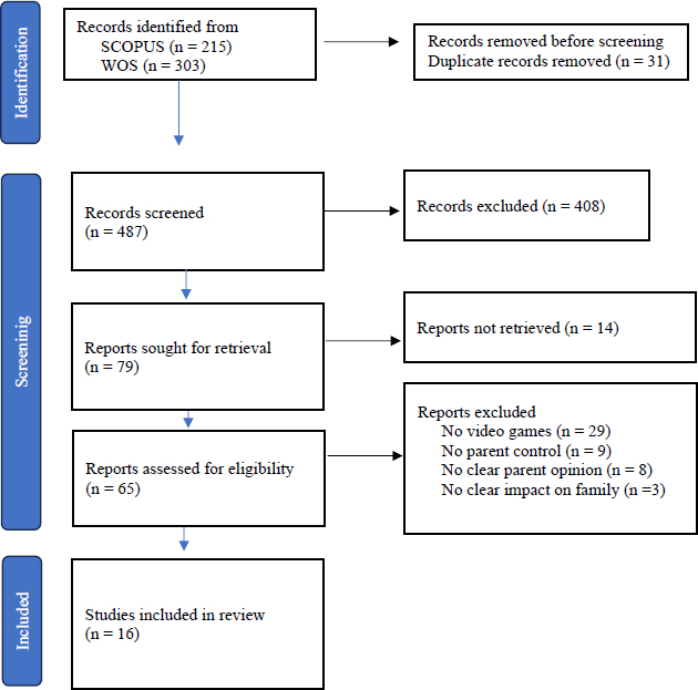 This systematic review was conducted following the PRISMA 2020 Fig. (1) process of selection to ensure a systematic, transparent, and replicable approach to the literature synthesis. Initial searches across Scopus (n=215) and WOS (n=303) yielded 518 records. After removing 31 duplicates, 487 unique records proceeded to the screening phase. This stage involved an independent review of titles, resulting in a total of 408 records being excluded. Subsequently, 79 reports were sought for full-text retrieval, with 14 not retrieved. The remaining 65 reports were assessed for eligibility, with a focus on the interplay between video games, parental opinions, parental control, and family relationships. This stringent process, guided by the PRISMA flowchart, ultimately included 16 studies for synthesis, with discrepancies resolved via consensus based on predefined inclusion criteria.