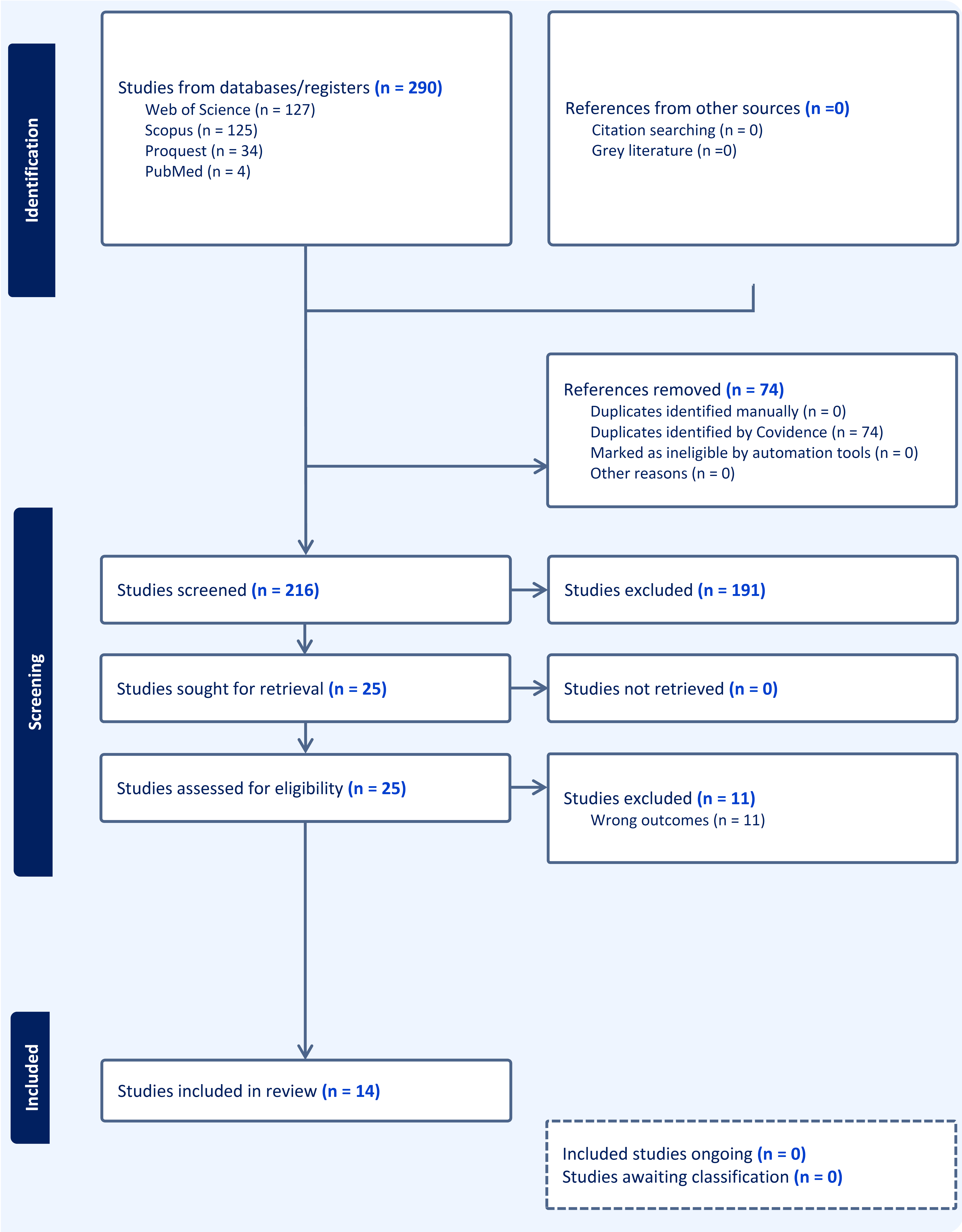 Four databases were included in the first search, and 290 studies were identified. Covidence identified 74 duplicates. Out of 216 studies screened, 25 were assessed for eligibility, and fourteen articles fulfilled the requirements for inclusion. Fig. (1) provides the article selection process.