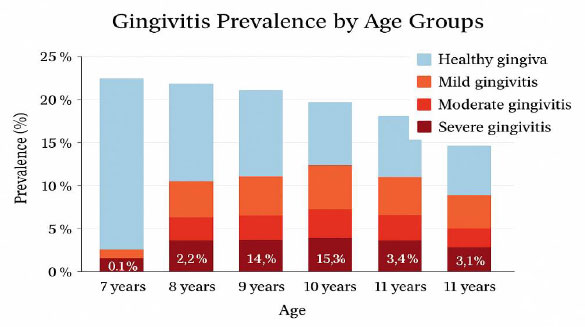 Prevalence of gingivitis by age groups and severity. The chart shows an increasing trend in gingivitis prevalence with age, from 12.4% in 7-year-olds to 22.9% in 11-year-olds. Most cases were classified as mild gingivitis, with moderate and severe cases being relatively uncommon.