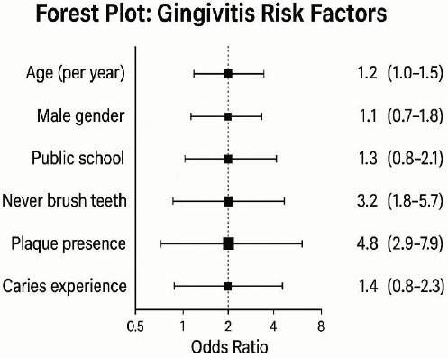 The multivariate analysis results provide valuable insights into the independent contributions of various risk factors to gingivitis development. The identification of plaque accumulation as the strongest predictor (OR = 4.8) confirms the primacy of bacterial factors in gingivitis etiology and supports the continued emphasis on plaque control in prevention strategies. The persistent significance of toothbrushing frequency in the multivariate model (OR = 3.2 for never brushing vs. twice daily) demonstrates that behavioral factors remain important even after accounting for plaque levels, suggesting that brushing frequency may serve as a proxy for overall oral health awareness and self-care behaviors.