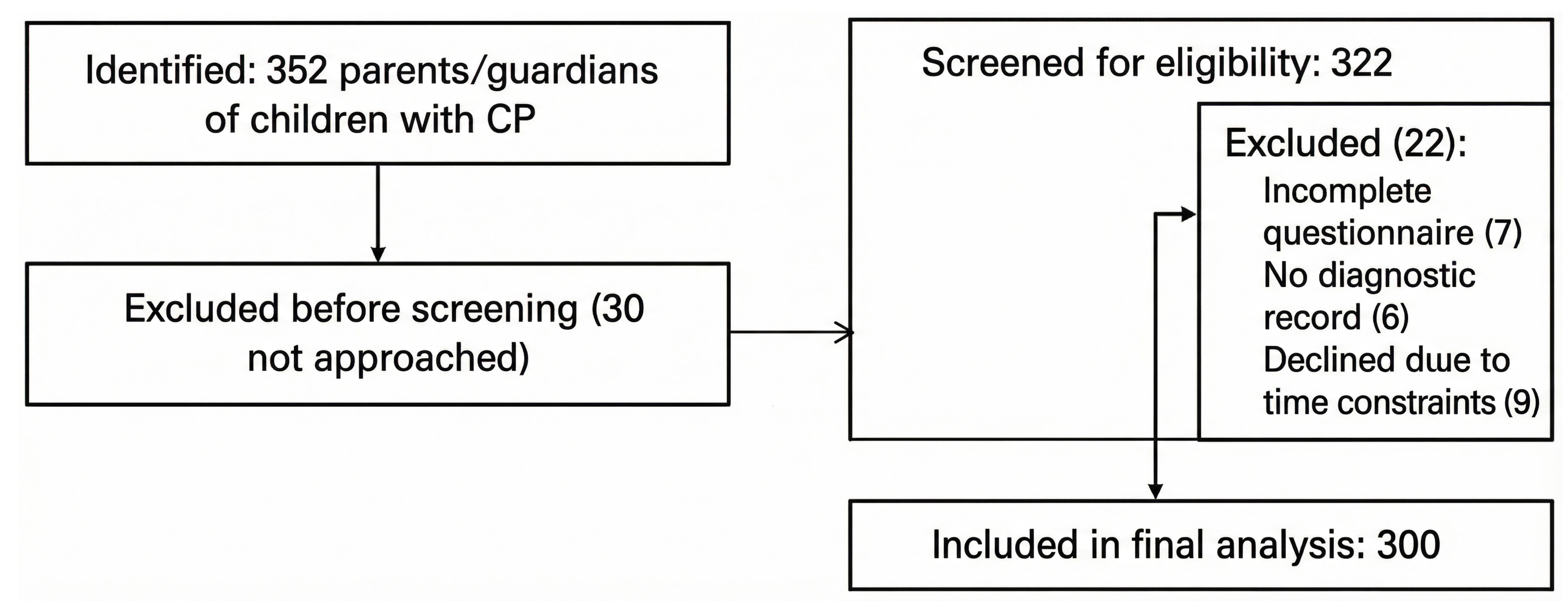 352 parents or caregivers of children with CP were approached across 12 recruitment sites, including hospitals, rehabilitation centers, and therapy clinics. After applying eligibility screening, 322 respondents met the inclusion criteria, and 22 were excluded for reasons such as incomplete questionnaires (n = 14) or lack of verified medical diagnosis (n = 8). Of the 322 eligible participants, 300 completed the survey, resulting in a final analytic sample of 300 respondents (response rate = 85.2%). No participants withdrew after questionnaire submission. Data completeness was high, with less than 2% missing responses imputed using mean substitution. Figure 1 presents the consistent participant inclusion flow.
